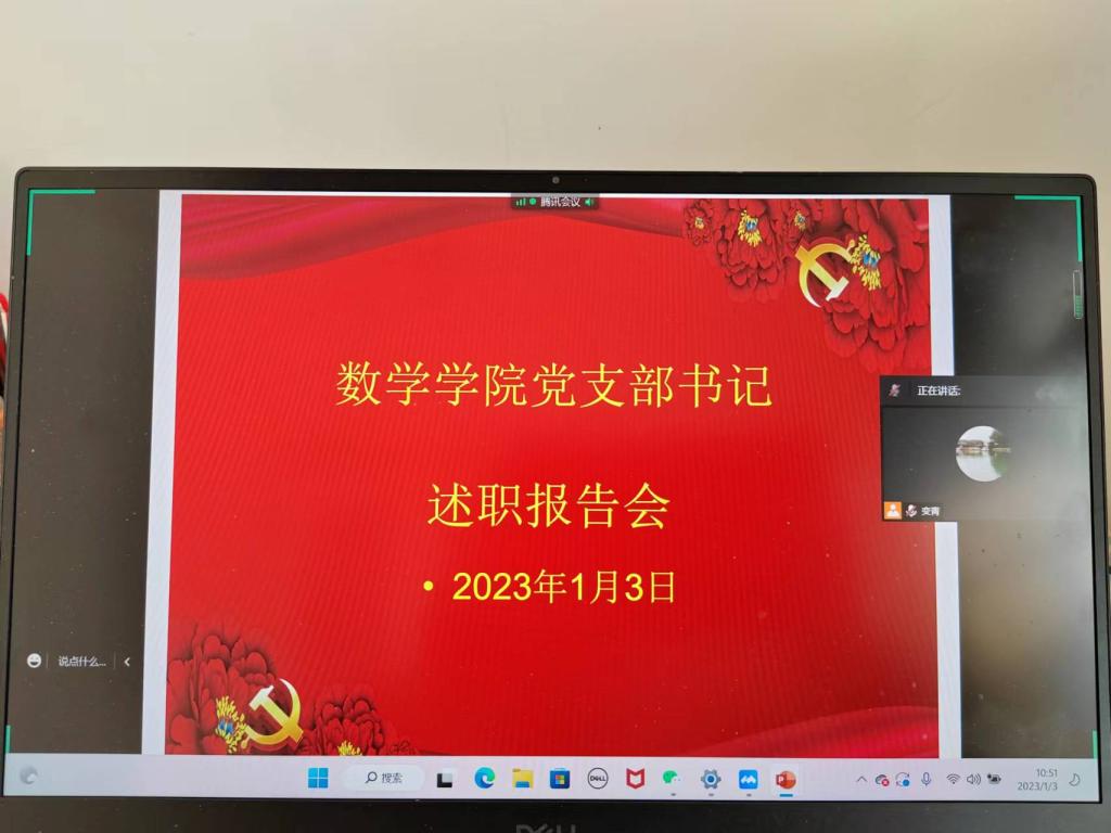 为进一步加强基层支部建设,压紧压实管党治党,强基固本的政治责任,数学学院积极贯彻落实校党委工作部署,2023年1月3日数学学院党委在腾讯会议平台召开了2022年度党支部书记述职报告会,6位党支部书记就本支部的年度工作开展情况进行了总结汇报。学院党委委员、各党支部书记参加了会议。学院党委书记薛亚奎主持会议。