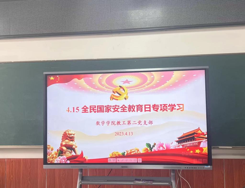 4月13日下午,在第八个全民国家安全教育日来临之际,数学学院教工第二党支部组织全体党员开展“4·15全民国家安全教育日专项学习”主题党日活动,旨在贯彻总体国家安全观,增强全民国家安全意识和素养,深刻领会国家安全教育的重要意义。活动中,党支部书记及支委委员通过聆听内容讲解、观看视频短片等形式带领全体党员深入学习新时代总体国家安全观的主要内容、范围领域和重要意义。最后,大家就此次专项学习发表自己的看法,共同探讨如何将维护国家安全贯彻落实到实践中去。通过本次专项学习主题党日活动,教工第二党支部全体党员深入了解了相关国家安全知识,深刻认识到国家安全面临的形势,树立了自觉维护国家安全的责任意识,进一步增强了为维护国家安全和社会稳定根基建设贡献力量的使命感。