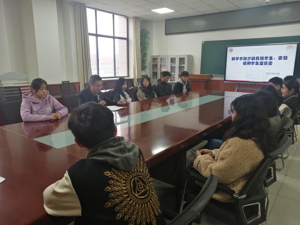 为更好地倾听我院少数民族、宗教信仰学生的心声,全面了解学生的学习、生活情况,不断强化学校全员育人、全过程育人、全方位育人的针对性与实效性,进一步增强少数民族学生、宗教信仰学生的归属感、获得感、成就感和幸福感,4月4日下午,数学学院组织召开了少数民族、宗教信仰学生座谈会。学院党委副书记孙俊伟、相关辅导员、以及大一大二少数民族学生和全体宗教信仰学生参加了座谈会。