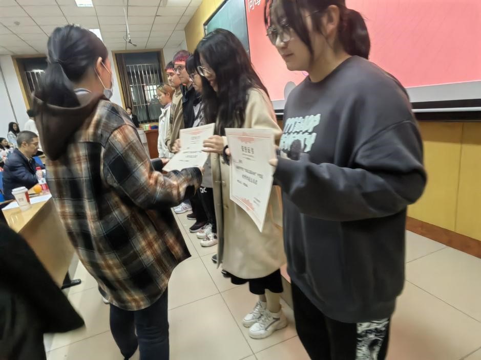 在此次数学学院优秀志愿者表彰大会伊使,全体演唱了共青团歌,歌曲激昂,展现了在此次防控疫情中志愿者们积极向上,不怕艰苦的精神。紧接着,大会迎来了最激动人心的时刻——颁奖环节。优秀志愿者们意气风发地站在台上,激动地等待着属于自己的荣耀。由李娜老师将一份份沉甸甸的奖状交到志愿者手中,激励着志愿者们奔赴下一场山海。