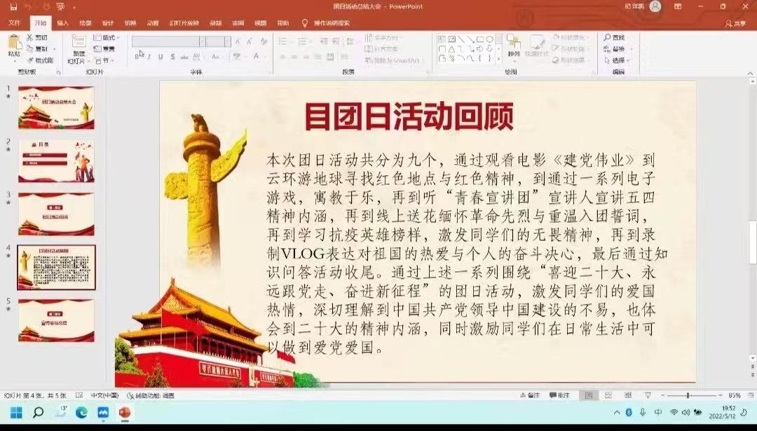 大会开始,团支部书记带领大家对团日活动回顾。本次团日活动共有九个,其中在活动观看电影《建党伟业》中,我们与革命先辈一起,共同经历了辛亥革命、袁世凯称帝、张勋复辟、五四运动、中国共产党第一次全国代表大会等耳熟能详的重大历史事件,我们一起愤怒、哀痛、无奈、兴奋、期待、和自豪;在活动“忆旧容,诉往昔,祭祖莫言悲”的活动中,我们重温入团誓词,还在线上对革命烈士进行扫墓,表达了我们对革命先烈的致敬;在活动听“青春宣讲团”宣讲五四精神内涵中,我们更加理解了五四精神,明白了当代青年身上的担子,明确了自己的志向.....在最后,由宣传委员对本次团日活动进行了总结。