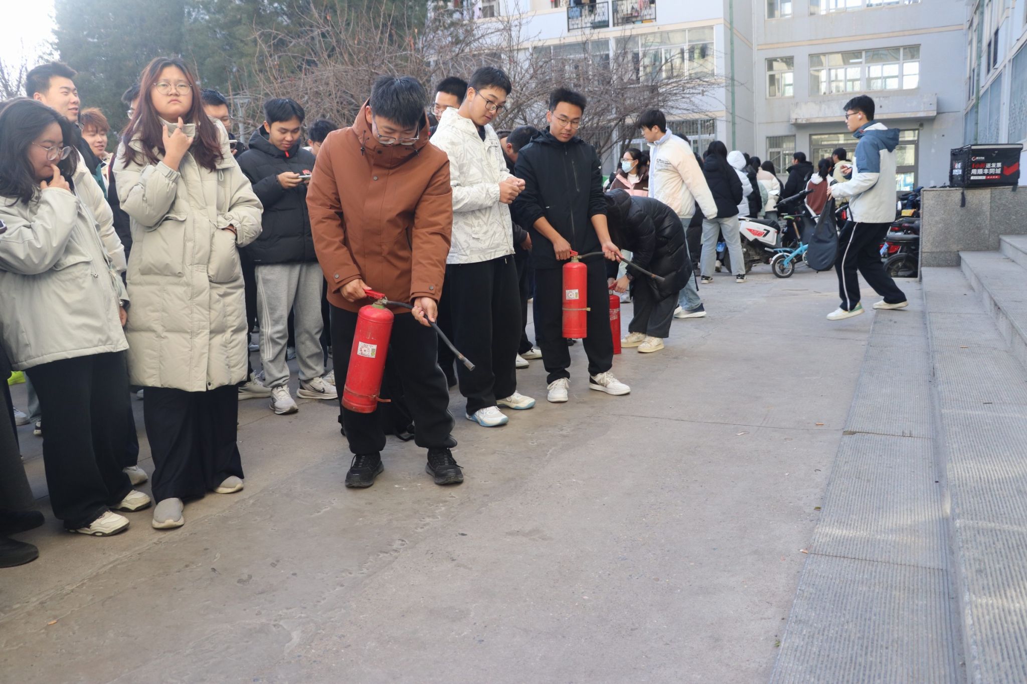 学院学生科于老师,在现场总结中强调:“我们通过本次演练达到以下效果,第一,熟悉逃生路线和流程,在嘈杂紧急的情况下,能够保持冷静,迅速有序撤离;第二,掌握基本自救技能;第三,强化消防安全意识和集体协作精神。接着于老师讲解演示了干粉灭火器的使用方法,强调了“提,拔、握、压”四字要领。在老师的指导下,同学们亲自体验了灭火器的使用,实现“理论知识”到“实践技能”的转化。