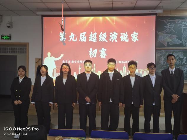为丰富校园文化生活,发掘学子语言表达潜力,并为第九届“超级演说家”决赛选拔优秀选手,2026年3月24日下午,数学学院第九届“超级演说家”初赛于09103H教室顺利举行。参赛选手以“以微光,赴远方”为主题,用声音传递热爱,用演讲点亮青春,为现场观众带来了一场思想与表达交融的青春盛宴。