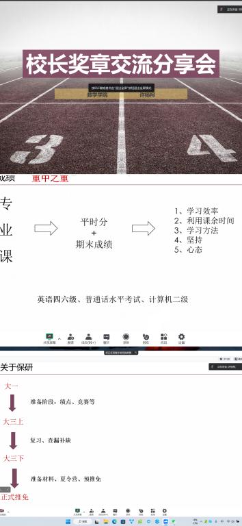 4月22日下午三点半,数学学院学习部在线上举办校长奖章分享会,由本学院校长奖章获得者许杨柯分享保研经验和校长奖章获得条件。校长奖章是我校表彰优秀学生最高荣誉,获得这个奖项代表着对学术、技能和社会责任的卓越成就。