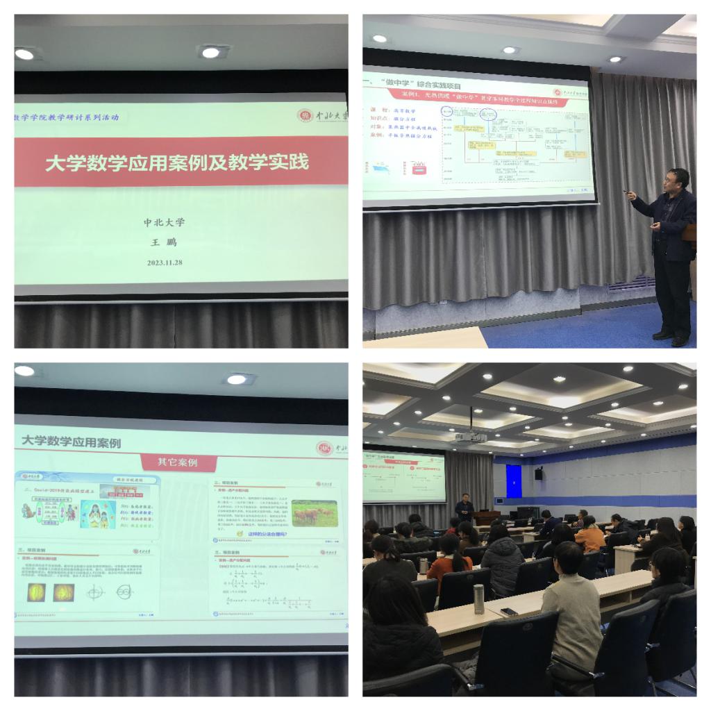 为贯彻落实党的二十大精神,落实我校关于“做中学”项目实践能力培养,11月28日下午,大学数学教学中心在9号楼924开展了有关高等数学课程的教学研讨。本次活动由中心主任宋妮老师主持,邀请我院副院长王鹏教授作了有关《大学数学应用案例及教学实践》讲座。