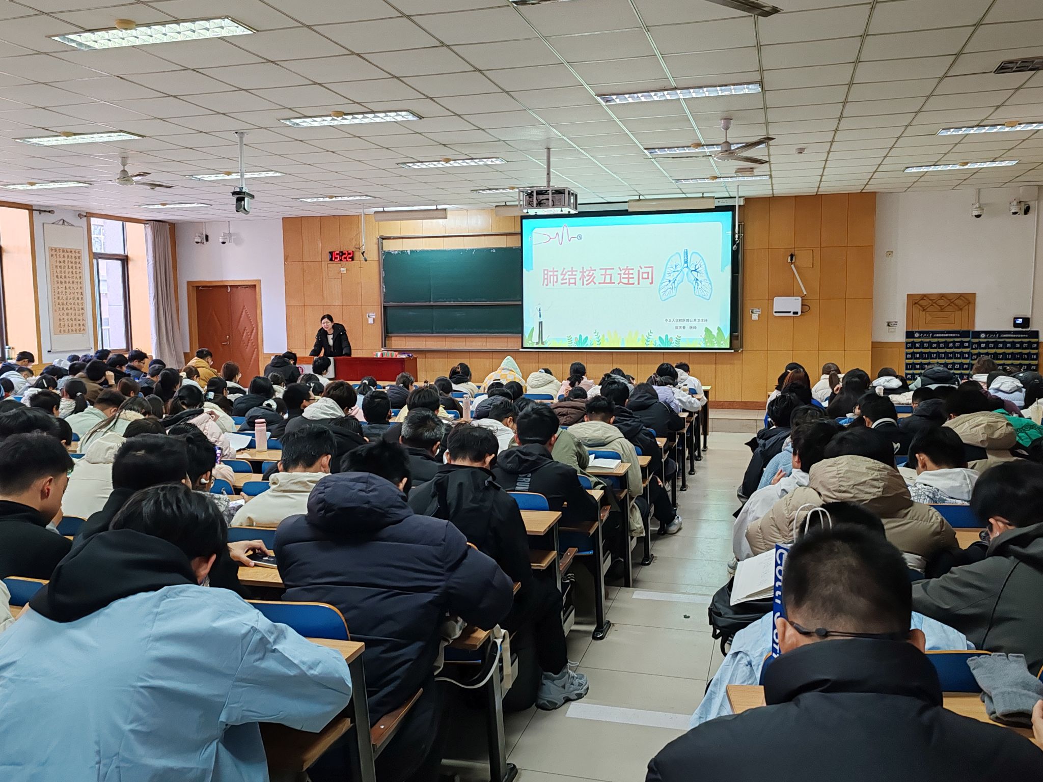 随后,中北大学校医院缑庆香医生为大家讲解——肺结核的防治,她系统的介绍了肺结核的常见症状、传播途径、预防治疗。她指出,肺结核主要通过空气传播,但可防可治,经过科学治疗大部分可以痊愈。讲座就“日常消毒如何做”、“宿舍通风标准”、“如何辨别肺炎与肺结核”等具体问题给大家进行深入讲解。学生通过讲座,学会如何科学保护自己和他人。
