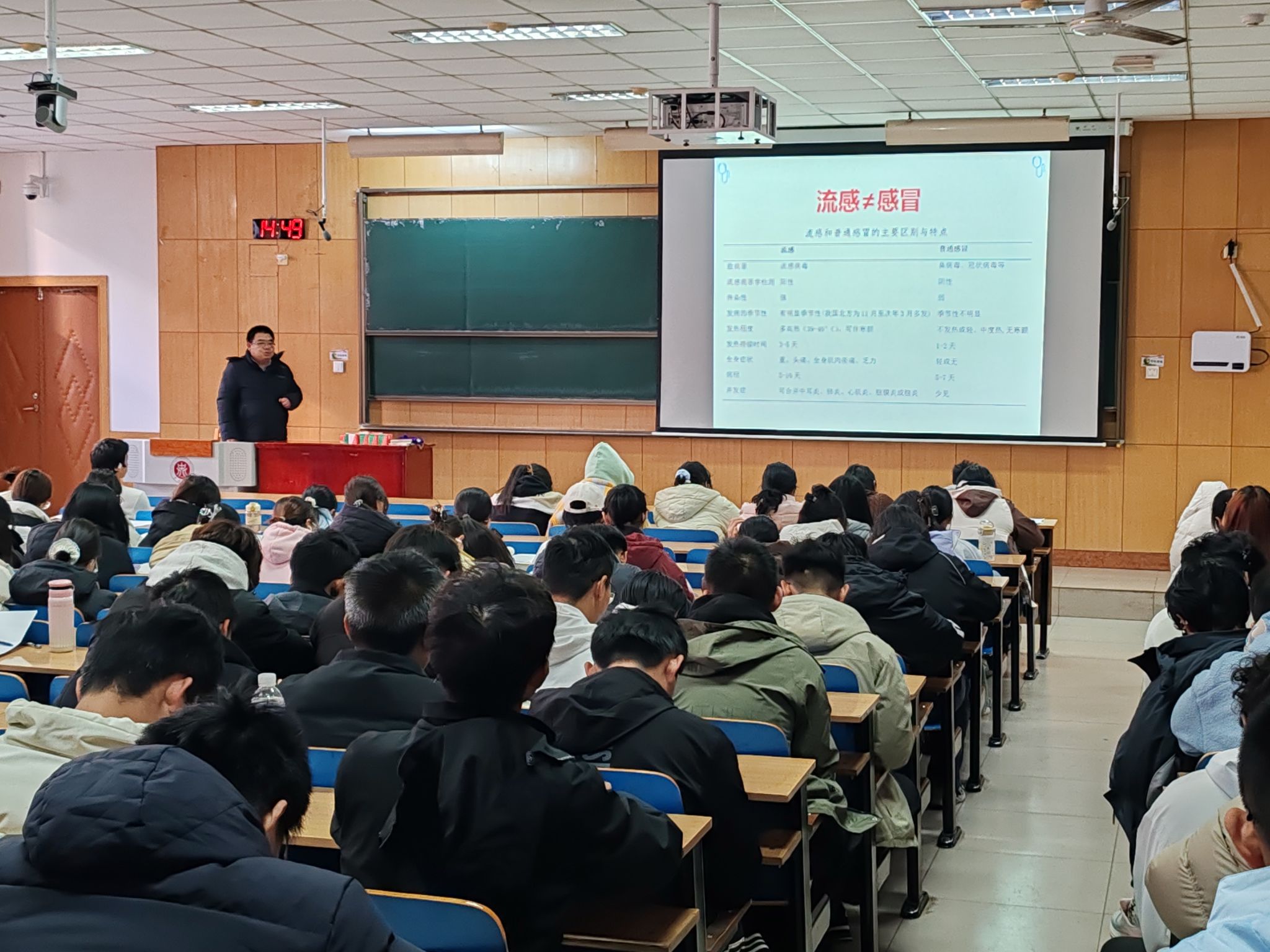 讲座伊始,中北大学校医院王鹏飞医生以近期呼吸道感染病情况,流感爆发趋势等,阐述了在人口密集的校园环境中开展防治工作的重要性与紧迫性。他深入浅出地讲解流行性感冒的病因,传播途径及典型症状,并着重区分了普通感冒与流行性感冒的本质区别。他结合大学生活的特点,给出了切实可行的预防建议:一、积极接种流感疫苗,是构建免疫屏障最有效的手段;二、保持良好卫生习惯,勤洗手,多通风,科学佩戴口罩;三、注重营养均衡,增强免疫力,避免熬夜透支健康。