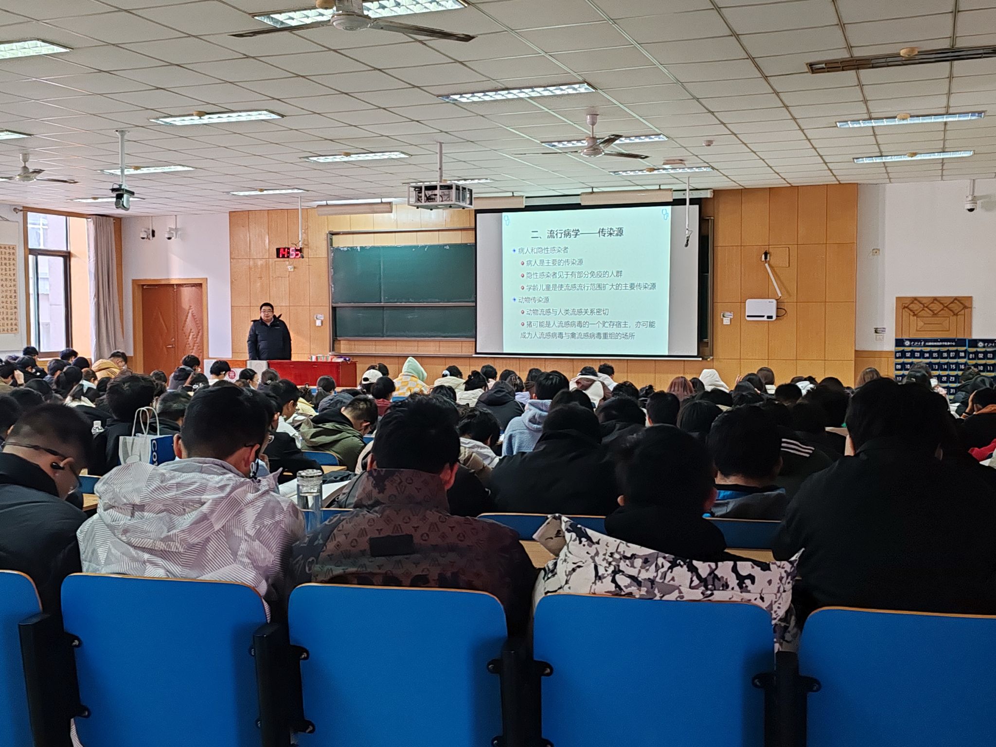 随着秋冬季节的来临,呼吸道传染疾病进入高发期,为提高我院学生对流感与肺结核的防控意识,普及核心健康知识,筑牢校园安全健康防线,11月18日下午,我院邀请中北大学校医院医生为数学学院2025级新生进行流感与肺结核校园知识讲座,300名新生到场聆听。