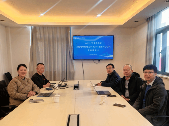 2025年12月15日上午,中北大学数学学院副院长王鹏、吴森林,概率统计系主任张峰等一行赴上海对外经贸大学统计与数据科学学院开展调研交流。上海对外经贸大学统计与数据科学学院党委书记黄静、院长张日权在古北校区热情接待了调研团队,双方相关科室负责人共同参与座谈。